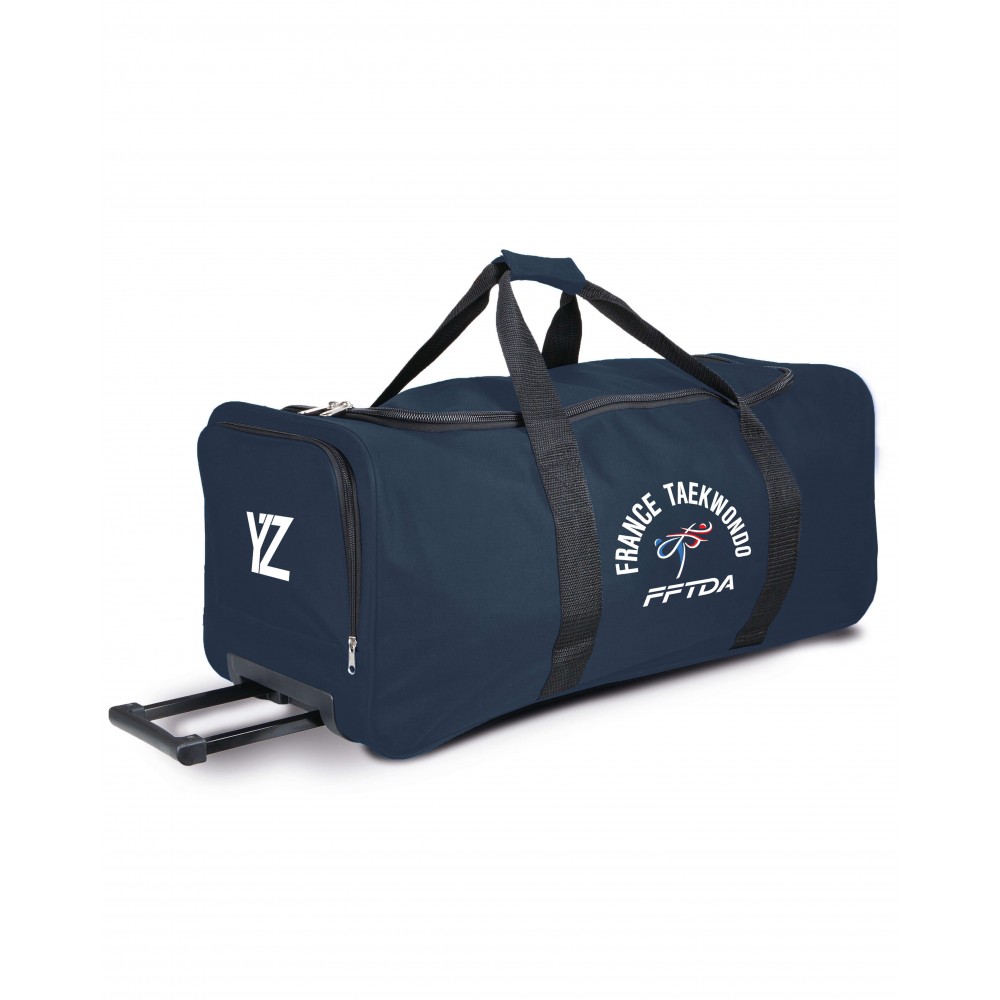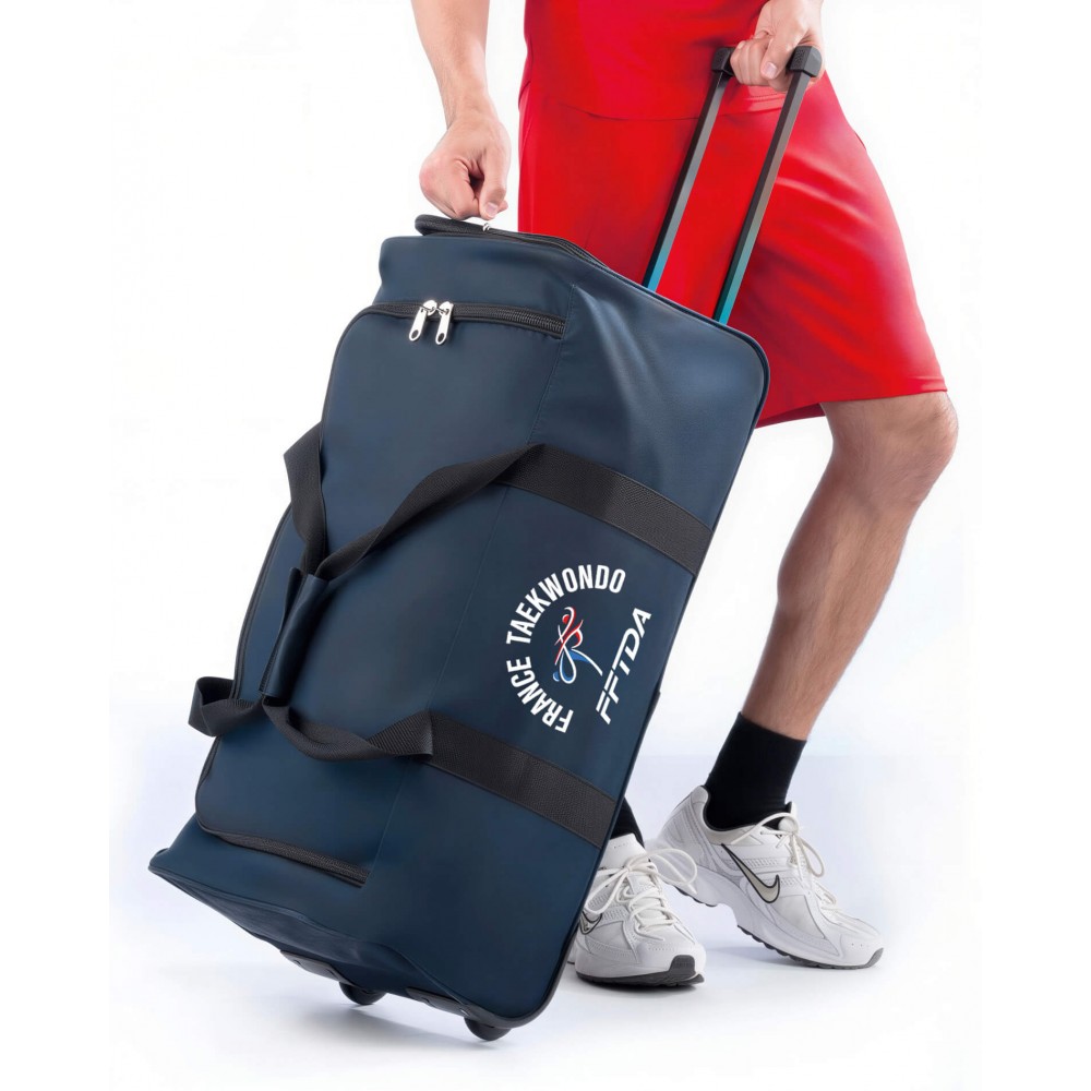 Le GRAND SAC DE SPORT FRANCE TAEKWONDO est pratique, épuré et idéal en tant que valise souple pour aller en compétition de taekwondo, aller à l'entrainement ou partir en voyage. Ce grand sac de sport possède une poignée rétractable et ajustable pour le tirer sur ses deux roues qualitatives et faciliter vos déplacements. Une immense poche intérieure pour y glisser votre dobok très facielement + une autre grande poche supérieure pour y glisser vos pitaines de taekwondo voire même votre linge sale pour qu'il ne "pollue pas" vos affaires propres à l'intérieure du sac. Une structure de renfort permet de poser le sac et qu'il soit juste assez rigide pour le déplacer sur ses roulettes. Le dessous du grand sac de sport france taekondo est renforcé pour une meilleure tenue et une plus grande longévité.
